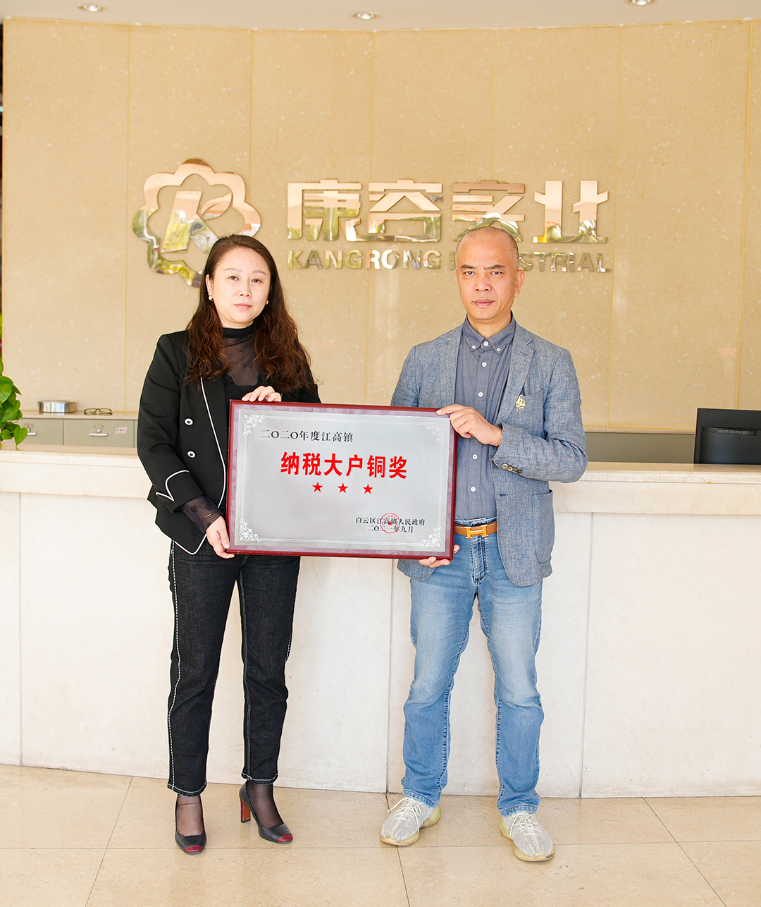 11月26日上午,白云区江高镇人民政府隆重举行2020年度纳税大户授牌大会,镇委镇政府主要领导分别向辖区内纳税大户企业代表颁授金银铜奖牌。会上,广东康容实业被授予2020年度江高镇“纳税大户铜奖”光荣称号。董事长张建洪出席授牌大会,并接受镇委政府主要领导授牌。