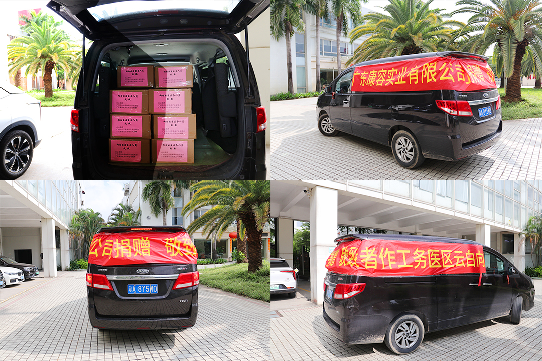 6月10日上午9点10分,一辆腰挂“向白云区医务工作致敬,广东康容实业捐赠”红色横幅的商务车,满载着抗疫防护物品,驶出了康容实业高新园区大门